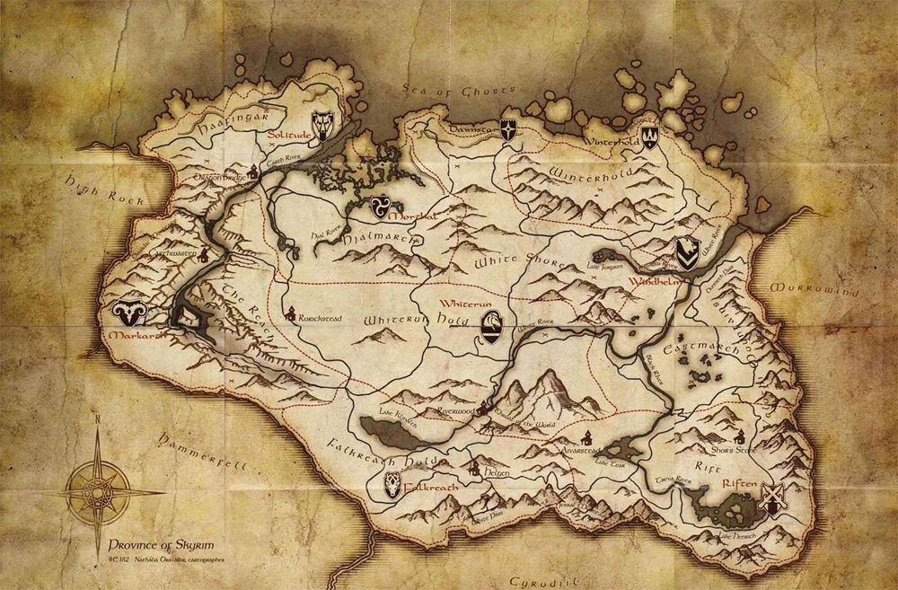 Para los que no conozcáis el juego os voy a resumir de que va. El vídeo juego nos mete en un mundo de rol de acción tipo mundo abierto, en el que nos meteremos en la piel de un personaje dovahkiin, para derrotar a Alduin , un dragón, que según la profecía, destruirá el mundo. El mapa de Skyrim es bastante extenso como se puede observar en la imagen, así que nos dará muchas horas de juego para que podamos disfrutarlo al máximo.